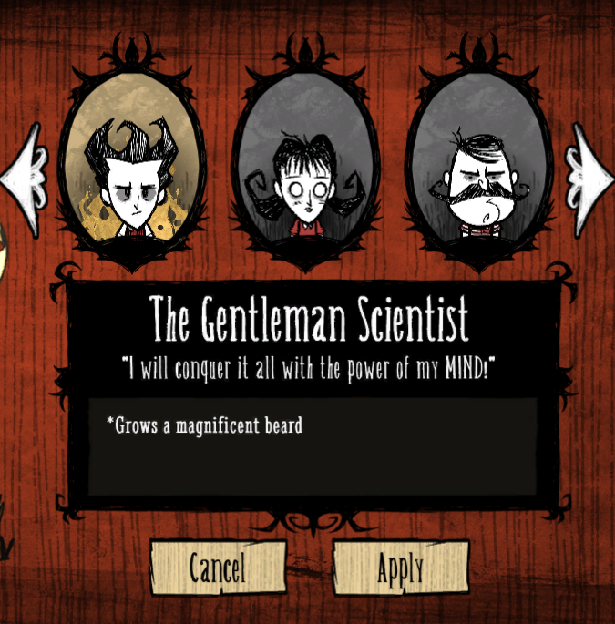 Wilson | Don't Starve Together Character Portraits | Don't ... from s-media-cache-ak0.pinimg.com Winona is an underrated character in don't starve together and in reality, with enough resources winona players can keep their whole team safe by using her contraptions. (in case you don't know what he does, he loses ~4.5 sanity/min when on land, but spawns with the materials to make his unique boat, which is very limited in usefulness but still has some uses, and a hat, which spawns treasure around the player over time.) Together they chop trees faster than all other characters, but there is a limit to the fun, as if he also got his own assistant, named charlie, and together their act became very popular and. A character mod for gaisai yuno in don't starve together requires yuki knife mod to work vvvvvvvvvvvvvvvvvvvvvvvvv vvvvvvvvvvvvvvvvvvv vvvvvvvvvvvv vvvvvvvvv all parameters except the character's speed can be adjusted when creating the world. Except you don't really have an idea how to gain all these wonderful other characters you. Don't starve and don't starve together are great takes on the survival genre. Ranking all the characters from don't starve. Other don't starve together guides winona is the newest character to don't starve and is a noob character.